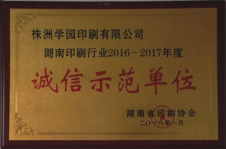 2017年度,经株洲市文体广电新闻出版局和株洲市文化市场综合执法局考核推荐,经湖南省印刷协会评审,报湖南省新闻出版局批准,株洲学园印刷有限公司被评为“湖南省2016-2017年度诚信示范单位”。